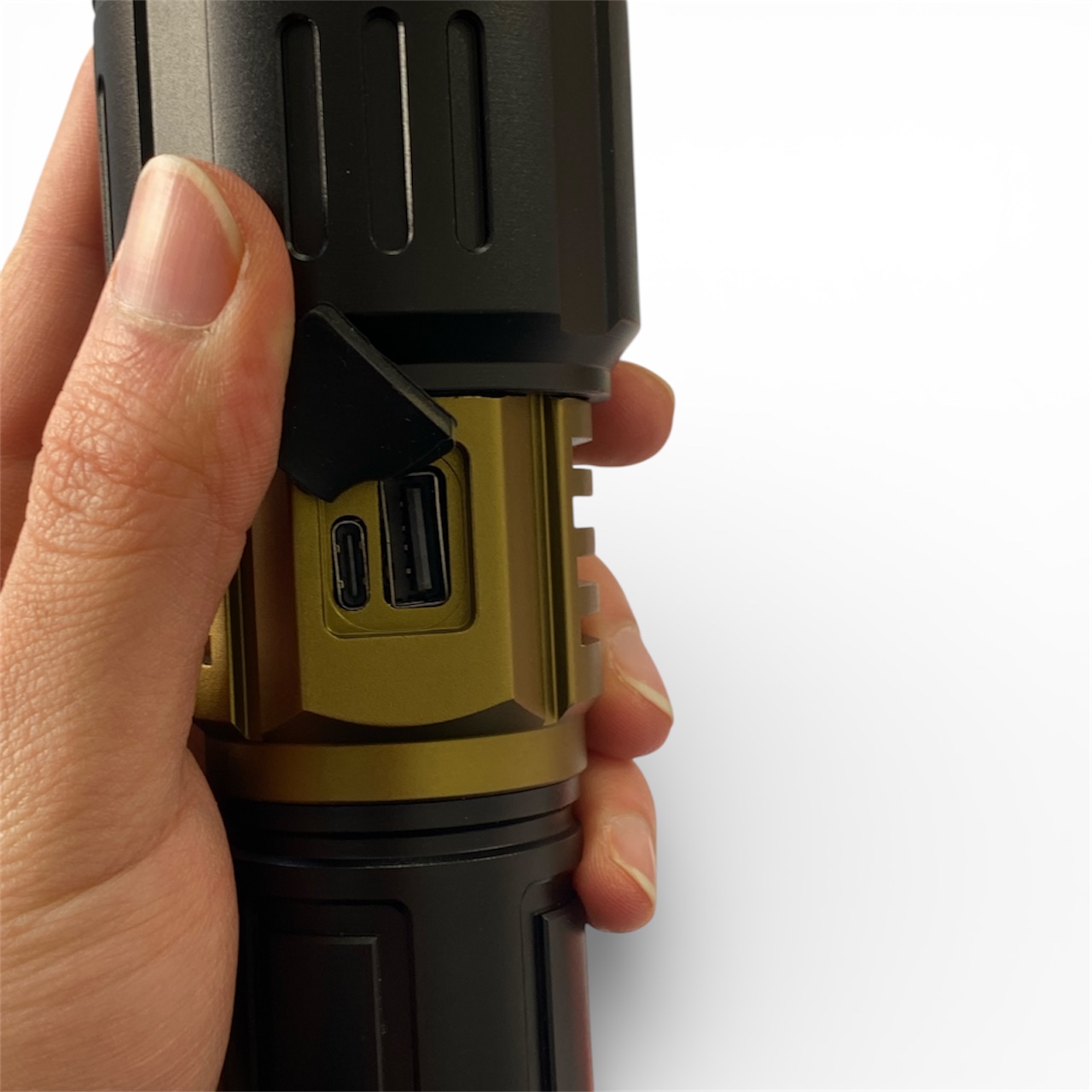 اسمال سان در مدل T305 به فکر دنیای مدرن بوده است. تجهیز این دستگاه به پورت Type-C یعنی شما میتوانید با همان کابل شارژر موبایلتان، چراغقوه را شارژ کنید. اما جذابیت اصلی، خروجی USB آن است. در مواقع اضطراری که شارژ گوشی شما تمام شده، T305 مثل یک پاوربانک قدرتمند به داد شما میرسد.