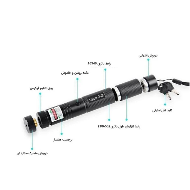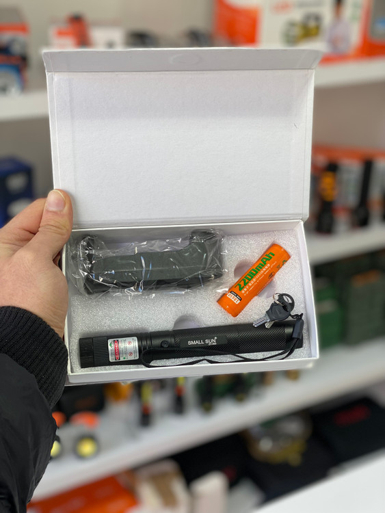 لیزر پوینتر اسمال سان Small Sun مدل ZY 303 منبع تغذیه یک عدد باتری قابل شارژ 18650، دارای دوشاخه متصل جهت اتصال به برق و شارژ مجدد باتری همراه حالت های نوردهی لیزر به صورت اشکال نقطه ای متنوع، به همراه دو عدد کلید جهت قفل کردن لیزر و حفظ ایمنی رنگ نور لیزر سبز، دارای کلید فیزیکی به منظور روشن و خاموش کردن و تغییر حالت نوردهی لیزر توان خروجی کلی 100 میلی وات، طول موج ایجاد شده 532 نانومتر دارای بند جهت پیچیدن دور مچ دست و حمل آسان تر