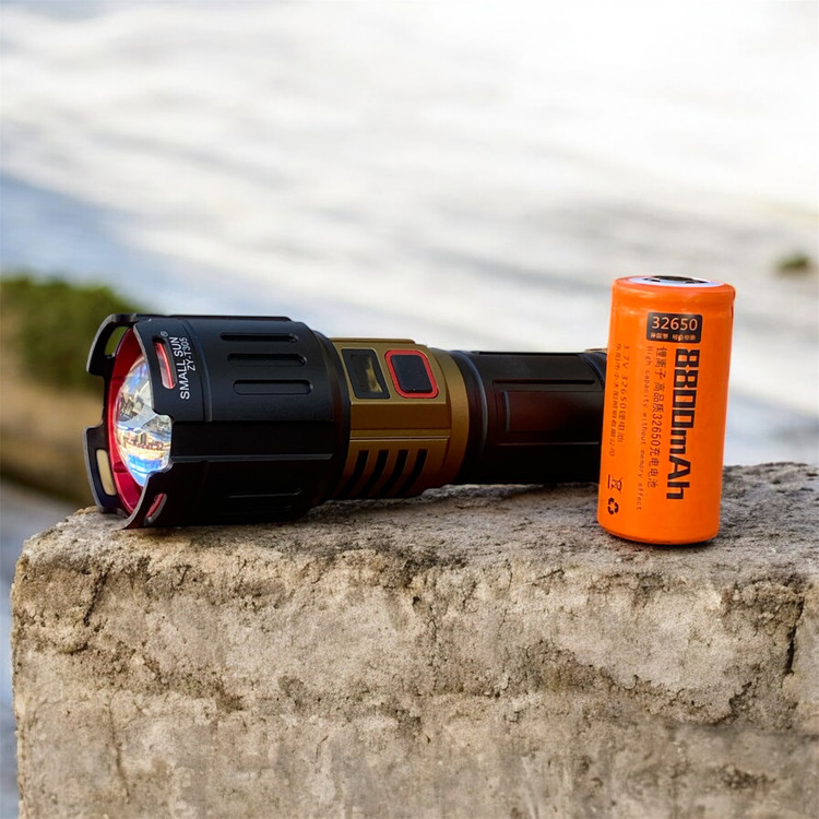 یکی از نقاط قوت این مدل، استفاده از باتری لیتیومی 32650 است. این باتری که با روکش نارنجی در پک اصلی قرار دارد، ظرفیت بسیار بالاتری نسبت به باتریهای معمولی دارد. ظرفیت 8800mAh درج شده روی آن، به شما این اطمینان را میدهد که در کمپینگهای طولانی یا شیفتهای نگهبانی، نگران تمام شدن ناگهانی نور نخواهید بود.