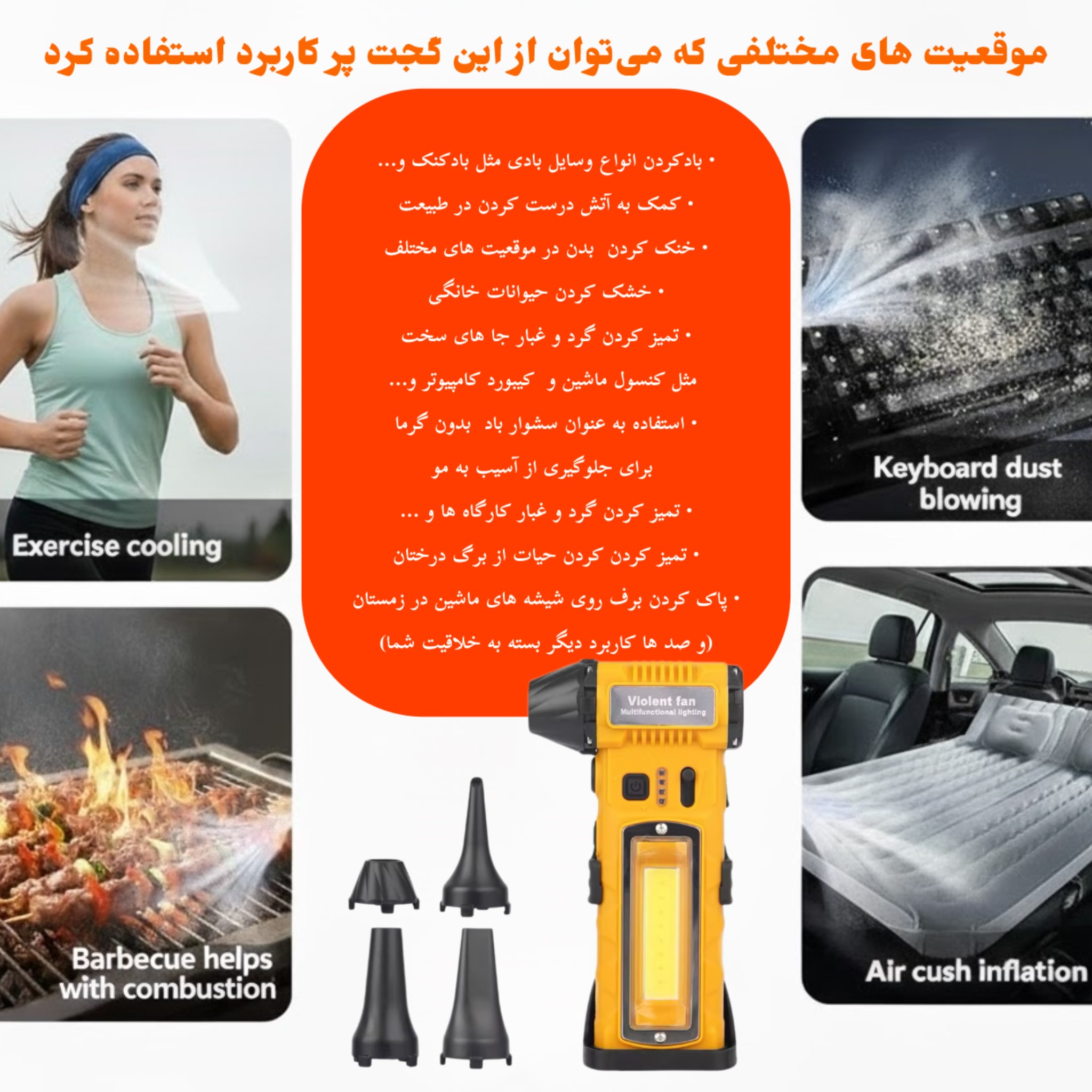 کوهنوردی و کمپینگ و داخل ماشین و منزل (در کل بسیار کاربردی هست و هر خانواده ای به یک عدد از این جت فن نیاز دارد)