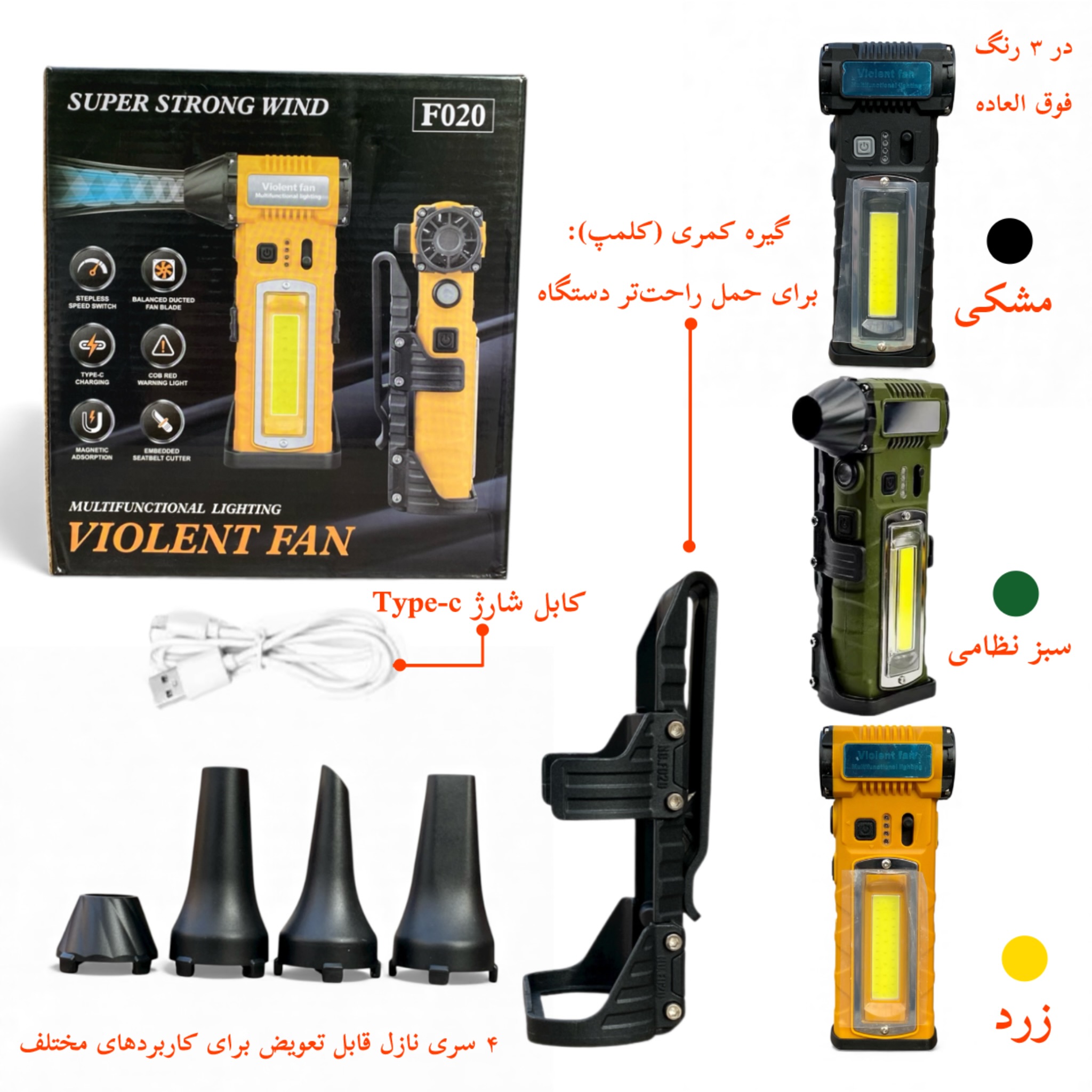 کنترل سرعت پیوسته و بینهایت متغیر، چهار نازل تخصصی، چراغ LED و چراغ COB جانبی، کاتر داخلی و پایه مغناطیسی از ویژگیهای منحصر به فرد این جت فن هستند. با Violent Fan F020، قدرت دمش حرفهای، انعطافپذیری کاربرد و راحتی کامل در استفاده را تجربه کنید و هر محیطی را به سرعت و بدون دردسر تمیز کنید.