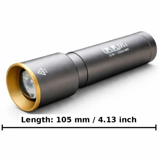 چراغ قوه جیبی شارژی زوم دار تلسکوپی (اصلی) برند کی کی KK مدل K1 بدنه آمینیوم باکیفیت با ۵۰۰ لومن قدرت نور و برد ۵۰۰ متر